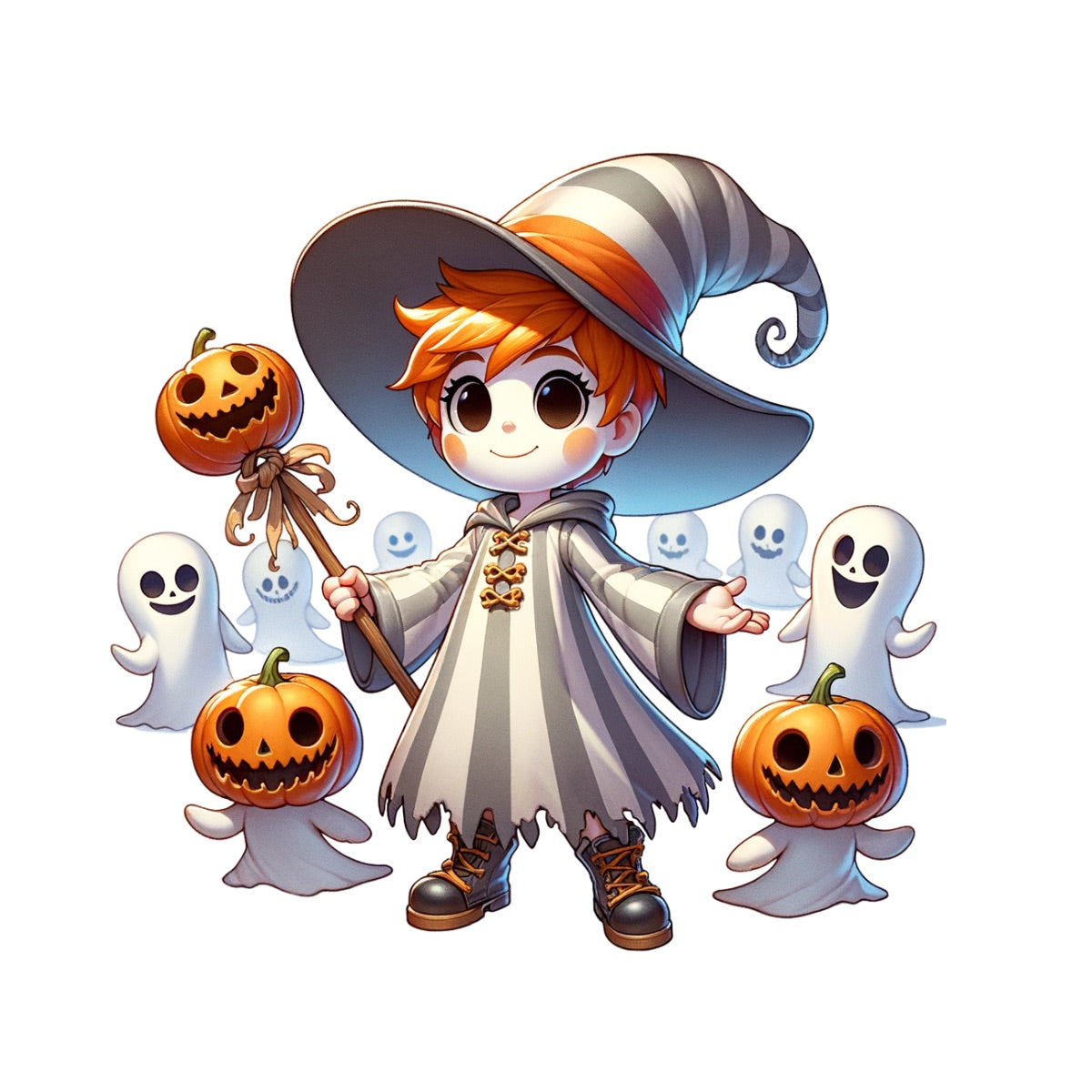 Cute Halloween Wizard Design – Chibi Witch Boy with Ghosts & Pumpkins